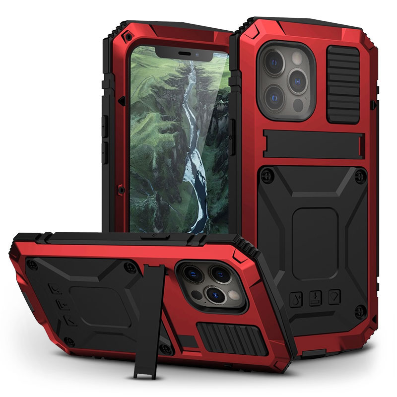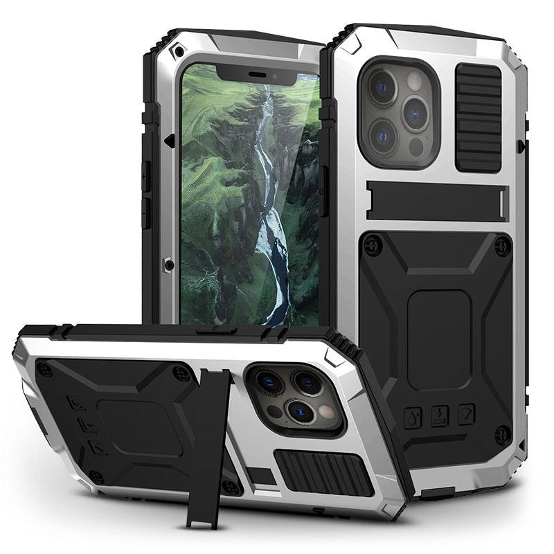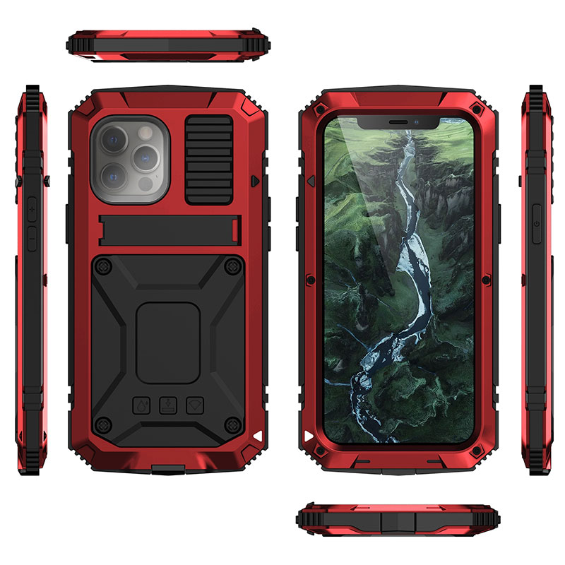 Coque de protection intégrale avant-arrière pour iPhone 12 Pro Max. Cette coque constitue un véritable rempart contre les chutes, les chocs, la poussière, le sable & les projections d'eau. Scellée à l'aide de 6 vis de fixation, elle se compose d'une housse centrale en gel de silicone absorbant, d'une armature en aluminium avant et arrière, et d'une protection d'écran en verre trempé. Pratique, vous pourrez utiliser son chevalet rétractable pour regarder vos vidéos en mode panoramique.